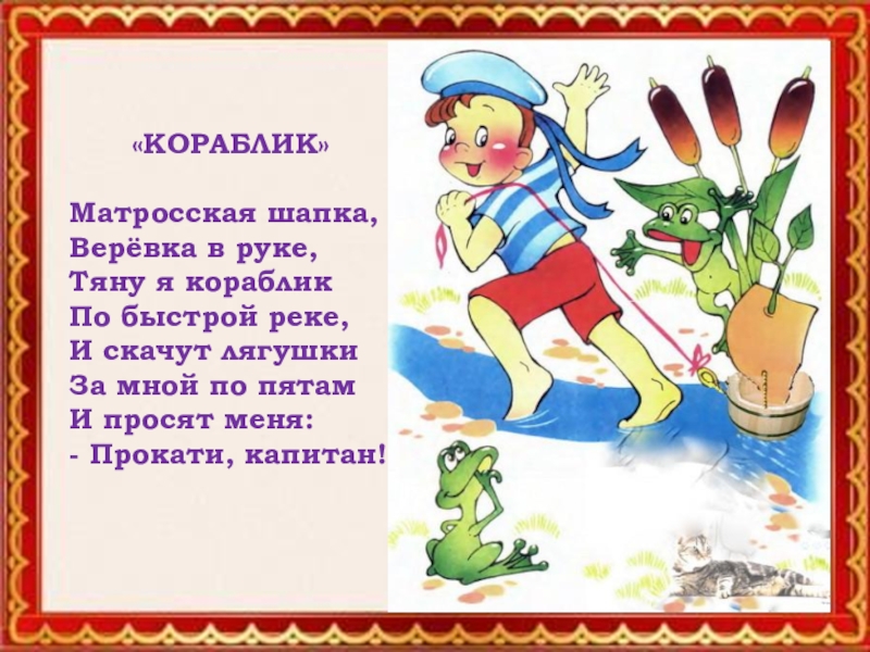 «КОРАБЛИК»Матросская шапка, Верёвка в руке,Тяну я корабликПо быстрой реке,И скачут лягушкиЗа мной по пятамИ просят меня:- Прокати,