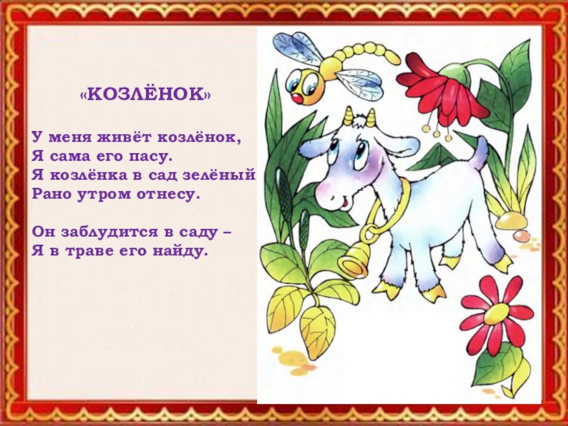 «КОЗЛЁНОК»У меня живёт козлёнок,Я сама его пасу.Я козлёнка в сад зелёныйРано утром отнесу.Он заблудится в саду –