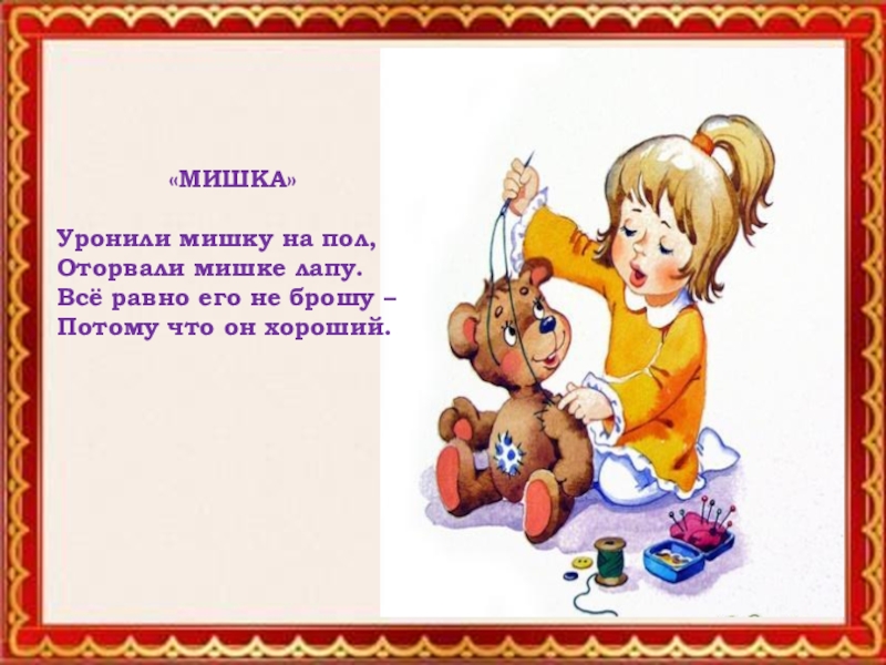 «МИШКА»Уронили мишку на пол, Оторвали мишке лапу.Всё равно его не брошу – Потому что он хороший.