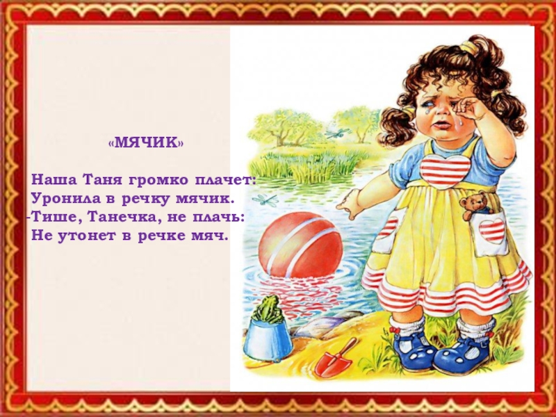 «МЯЧИК»Наша Таня громко плачет:Уронила в речку мячик.Тише, Танечка, не плачь:Не утонет в речке мяч.