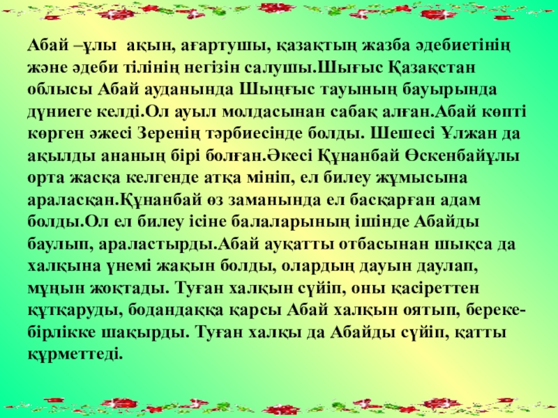 Балаларды Абай ата ларының өмірімен таныстыру, өз елінің маңызды мәселелерін шешуге