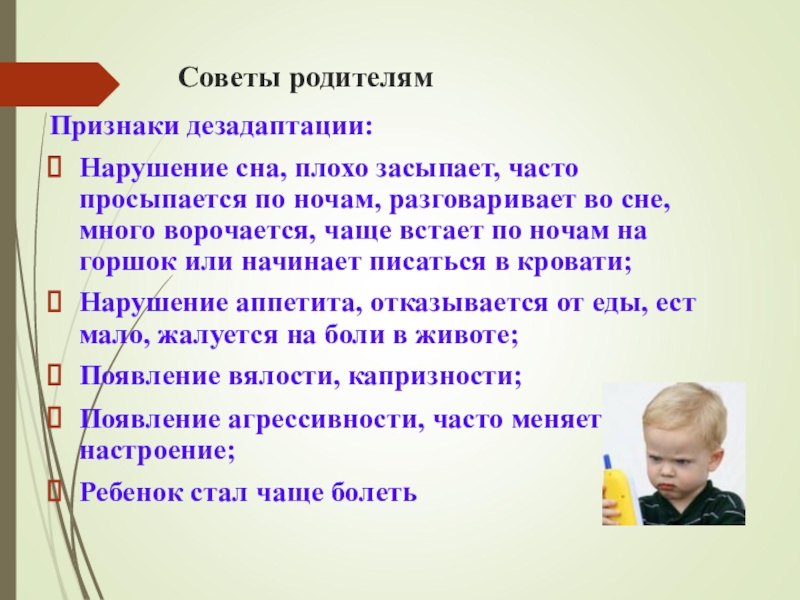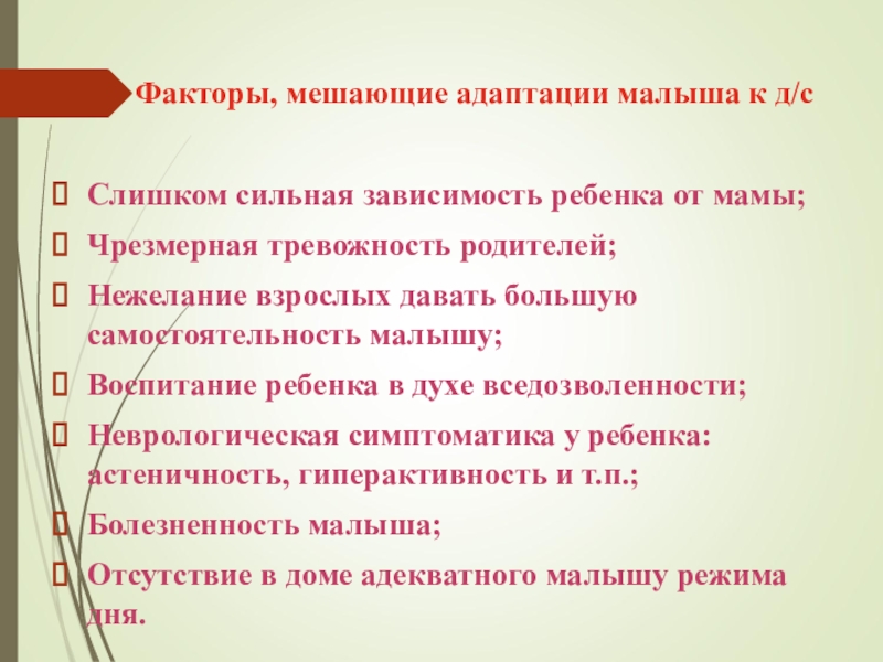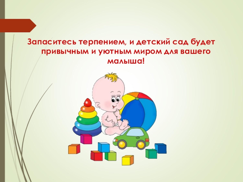 в первые дни посещения группы побудьте с ребенком, не оставляйте его сразу надолго в д/саду.