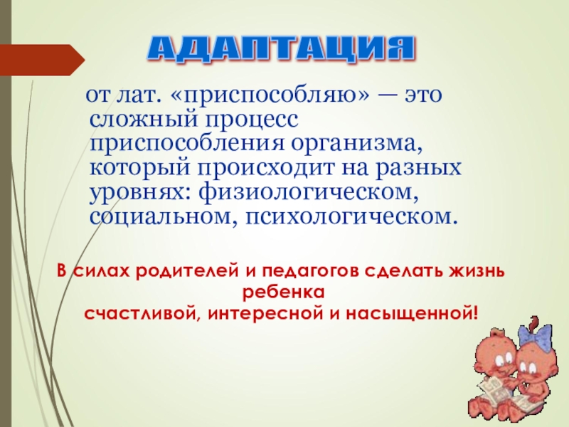 от лат. «приспособляю» — это сложный процесс приспособления организма, который происходит на разных уровнях: физиологическом, социальном, психологическом.