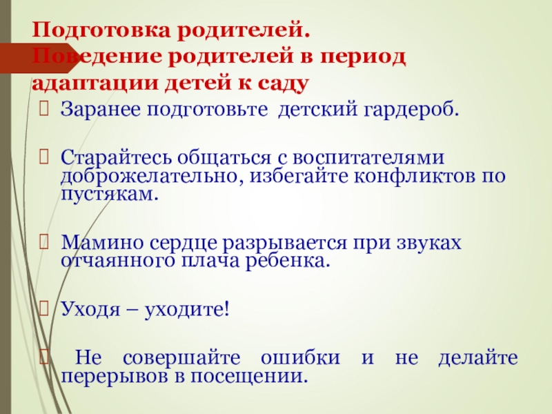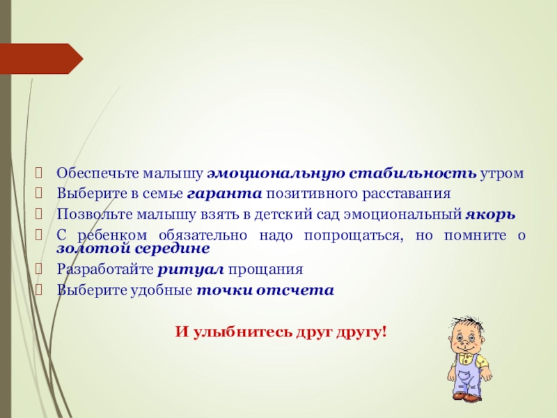 после 1-2 дней присутствия ребенка в группе научитесь мягко, но коротко расставаться с ним.