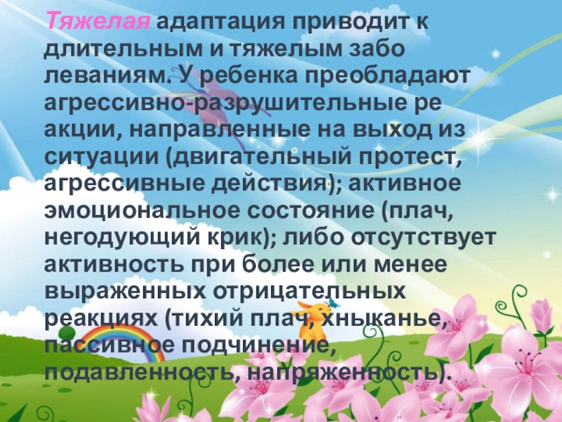 Слайд 5Тяжелая адаптация приводит к длительным и тяжелым заболеваниям. У ребенка преобладают