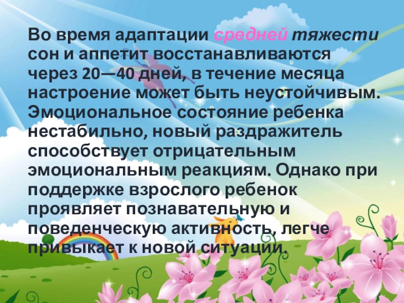 дней, в течение месяца настроение может быть неустойчивым. Эмоциональное состояние ребенка нестабильно, новый раздражитель способствует отрицательным эмоциональным реакциям. Однако при поддержке взрослого ребенок проявляет познавательную и поведенческую активность, легче привыкает к новой ситуации.
