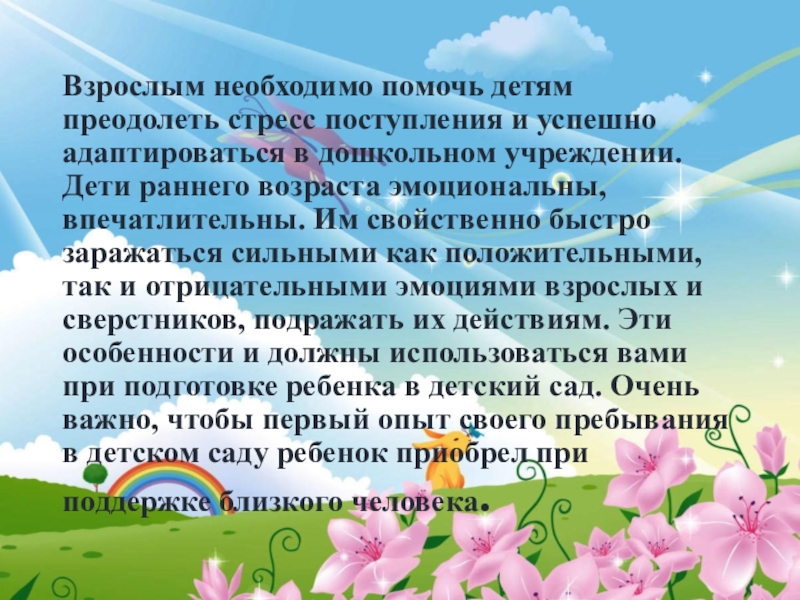дошкольном учреждении. Дети раннего возраста эмоциональны, впечатлительны. Им свойственно быстро заражаться сильными как положительными, так и отрицательными эмоциями взрослых и сверстников, подражать их действиям. Эти особенности и должны использоваться вами при подготовке ребенка в детский сад. Очень важно, чтобы первый опыт своего пребывания в детском саду ребенок приобрел при поддержке близкого человека.
