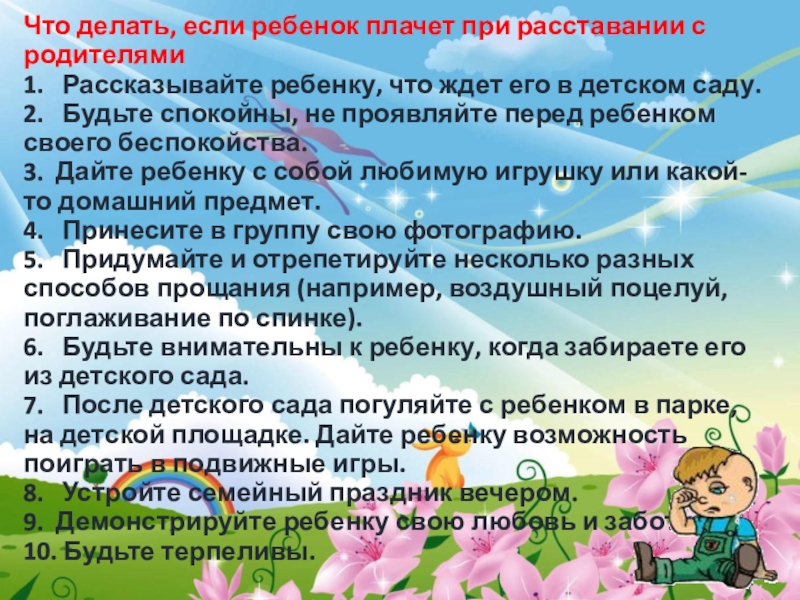 Слайд 10Что делать, если ребенок плачет при расставании с