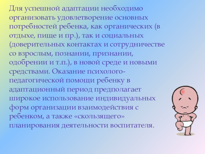 Слайд 11Для успешной адаптации необходимо организовать удовлетворение основных потребностей ребенка, как органических