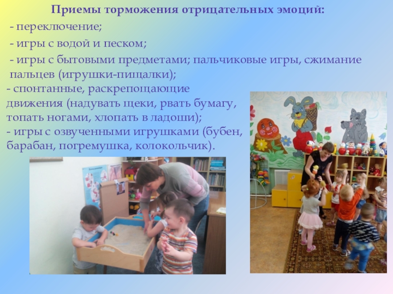 - игры и бытовые процессы каждодневно дополняют приемами торможения отрицательных эмоций;