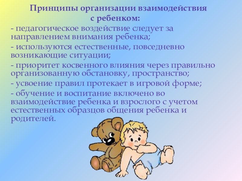 - обучение и воспитание включено во взаимодействие ребенка и взрослого с учетом естественных образцов общения ребенка и родителей.