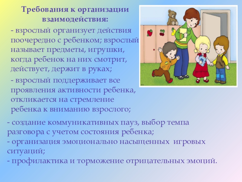 - создание коммуникативных пауз, выбор темпа разговора с учетом состояния ребенка;