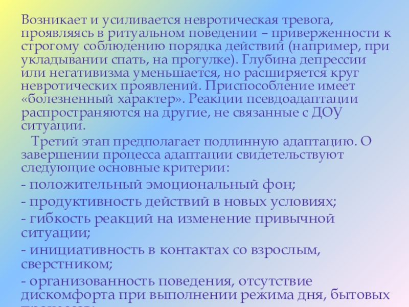 к строгому соблюдению порядка действий (например, при укладывании спать, на прогулке). Глубина депрессии или негативизма уменьшается, но расширяется круг невротических проявлений. Приспособление имеет «болезненный характер». Реакции псевдоадаптации распространяются на другие, не связанные с ДОУ ситуации.