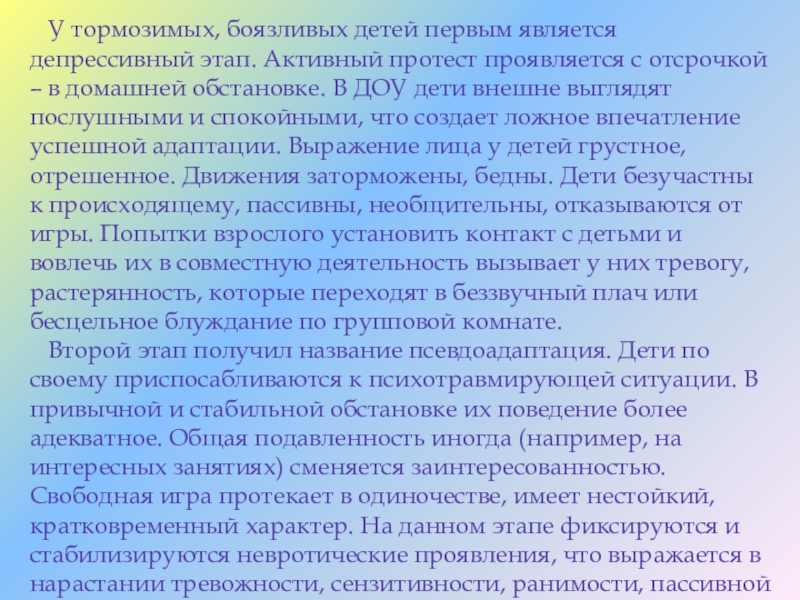 Слайд 9 У тормозимых, боязливых детей первым является депрессивный этап. Активный