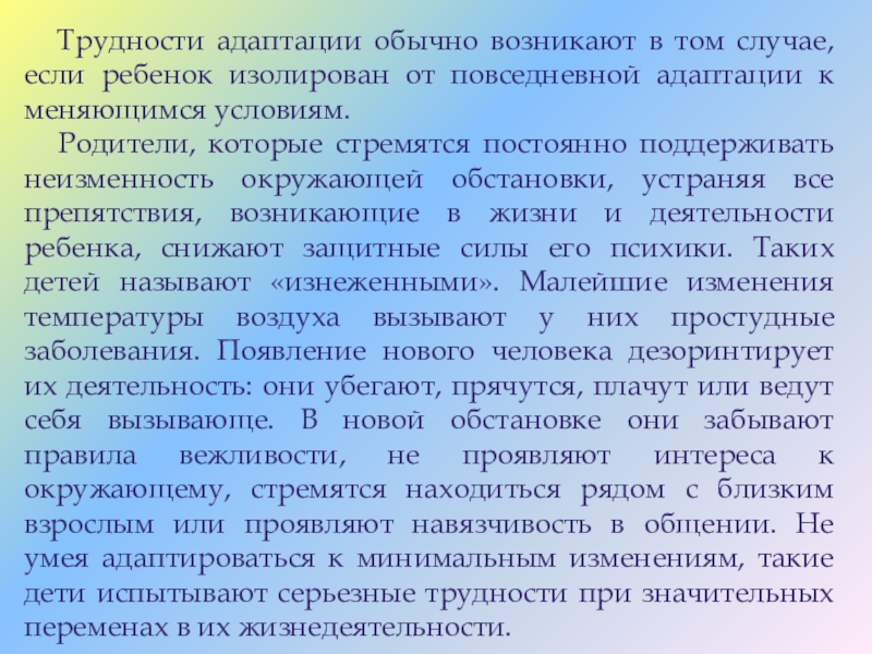 Родители, которые стремятся постоянно поддерживать неизменность окружающей обстановки, устраняя все препятствия, возникающие в жизни и деятельности ребенка, снижают защитные силы его психики. Таких детей называют «изнеженными». Малейшие изменения температуры воздуха вызывают у них простудные заболевания. Появление нового человека дезоринтирует их деятельность: они убегают, прячутся, плачут или ведут себя вызывающе. В новой обстановке они забывают правила вежливости, не проявляют интереса к окружающему, стремятся находиться рядом с близким взрослым или проявляют навязчивость в общении. Не умея адаптироваться к минимальным изменениям, такие дети испытывают серьезные трудности при значительных переменах в их жизнедеятельности.