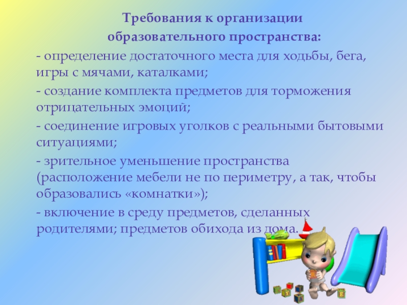 - приоритет косвенного влияния через правильно организованную обстановку, пространство;