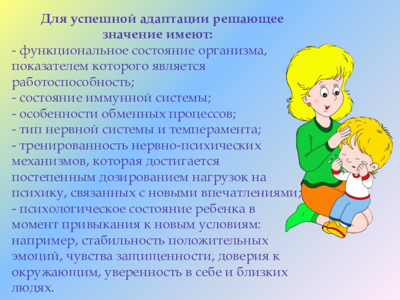 - психологическое состояние ребенка в момент привыкания к новым условиям: например, стабильность положительных эмоций, чувства защищенности, доверия к окружающим, уверенность в себе и близких людях.
