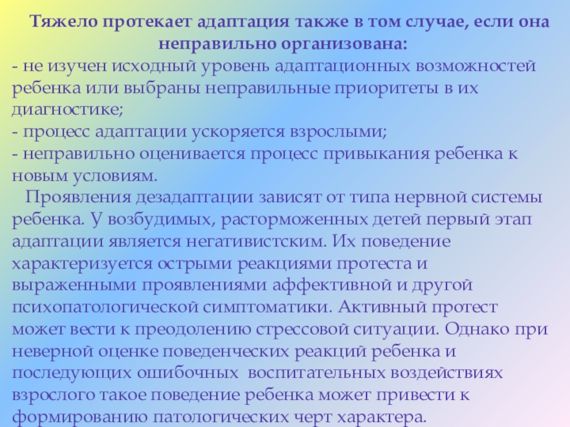 Проявления дезадаптации зависят от типа нервной системы ребенка. У возбудимых, расторможенных детей первый этап адаптации является негативистским. Их поведение характеризуется острыми реакциями протеста и выраженными проявлениями аффективной и другой психопатологической симптоматики. Активный протест может вести к преодолению стрессовой ситуации. Однако при неверной оценке поведенческих реакций ребенка и последующих ошибочных воспитательных воздействиях взрослого такое поведение ребенка может привести к формированию патологических черт характера.