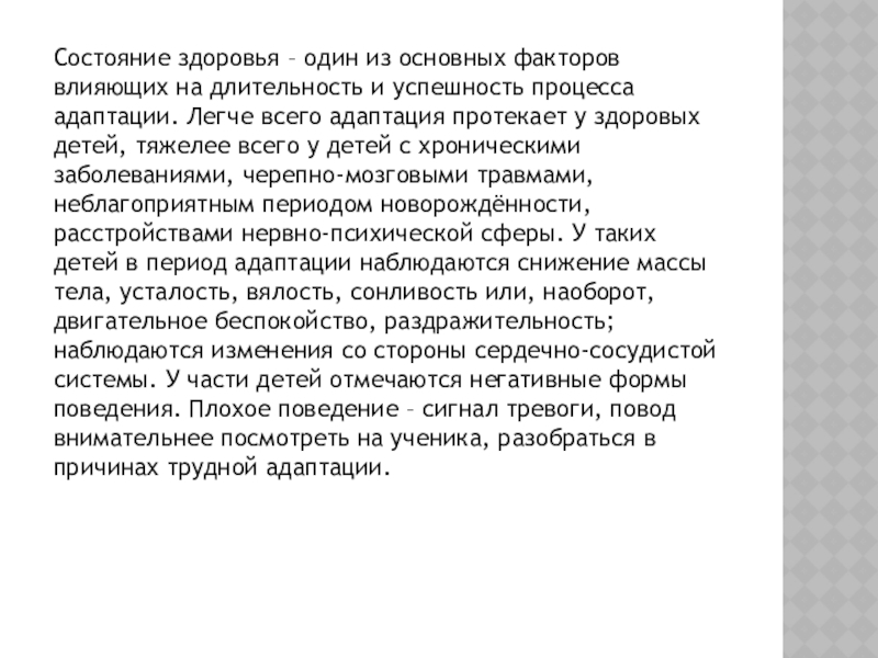 успешность процесса адаптации. Легче всего адаптация протекает у здоровых детей, тяжелее всего у детей с хроническими заболеваниями, черепно-мозговыми травмами, неблагоприятным периодом новорождённости, расстройствами нервно-психической сферы. У таких детей в период адаптации наблюдаются снижение массы тела, усталость, вялость, сонливость или, наоборот, двигательное беспокойство, раздражительность; наблюдаются изменения со стороны сердечно-сосудистой системы. У части детей отмечаются негативные формы поведения. Плохое поведение – сигнал тревоги, повод внимательнее посмотреть на ученика, разобраться в причинах трудной адаптации.