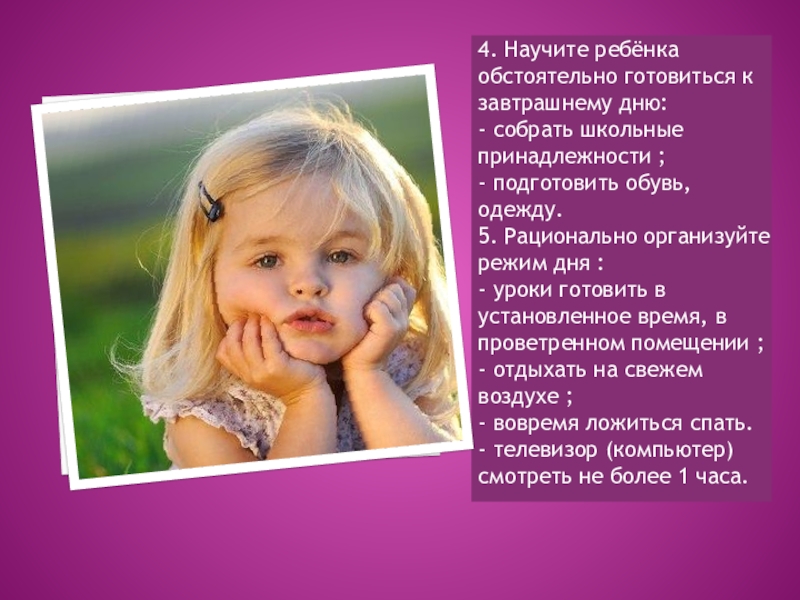 Слайд 124. Научите ребёнка обстоятельно готовиться к завтрашнему дню: