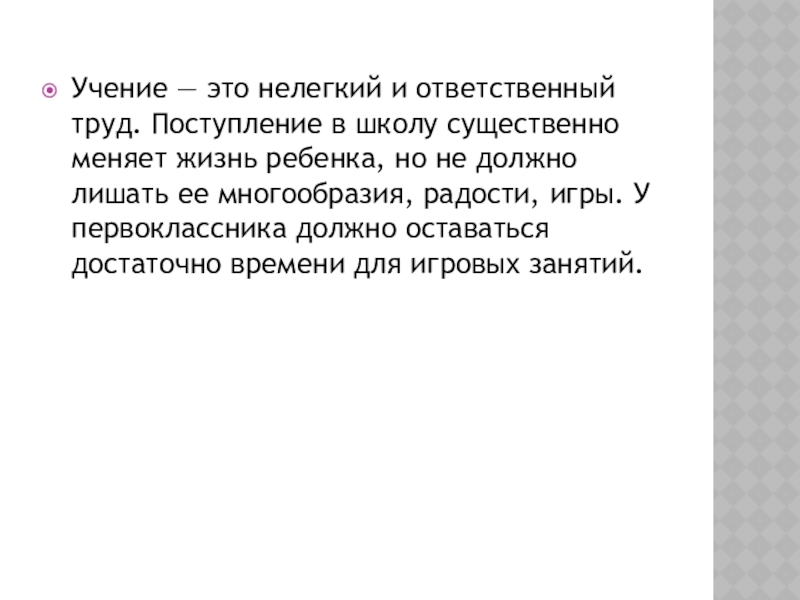 Слайд 9Учение — это нелегкий и ответственный труд. Поступление в школу существенно