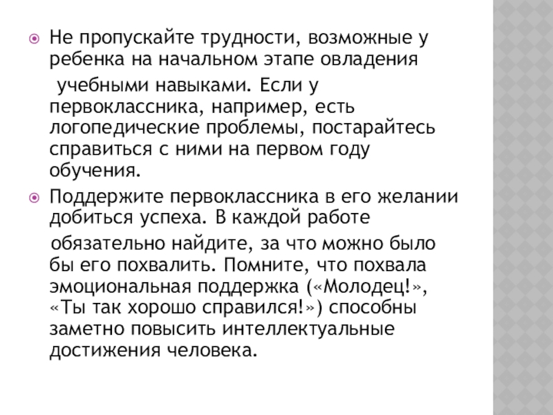 Слайд 7Не пропускайте трудности, возможные у ребенка на начальном этапе овладения