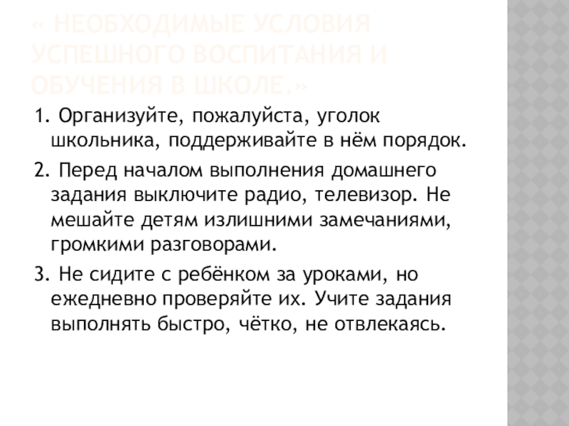 Слайд 11« Необходимые условия успешного воспитания и обучения в школе.»