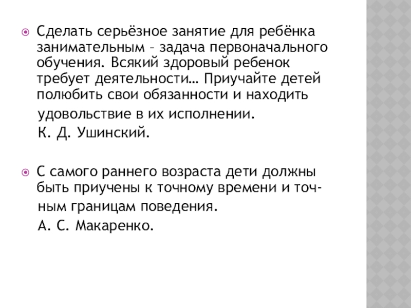 Слайд 10Сделать серьёзное занятие для ребёнка занимательным – задача первоначального обучения. Всякий