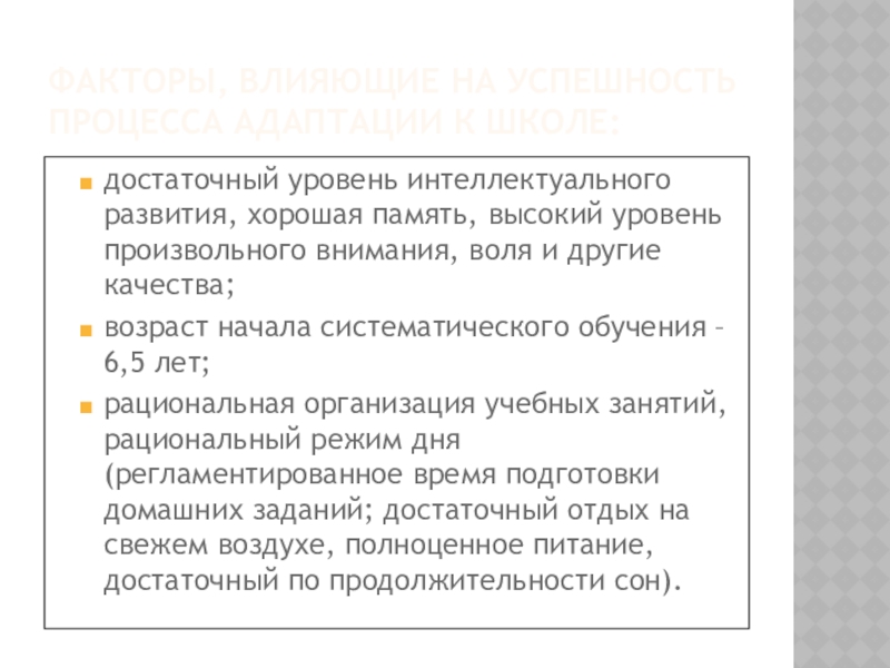 Слайд 4Факторы, влияющие на успешность процесса адаптации к школе: