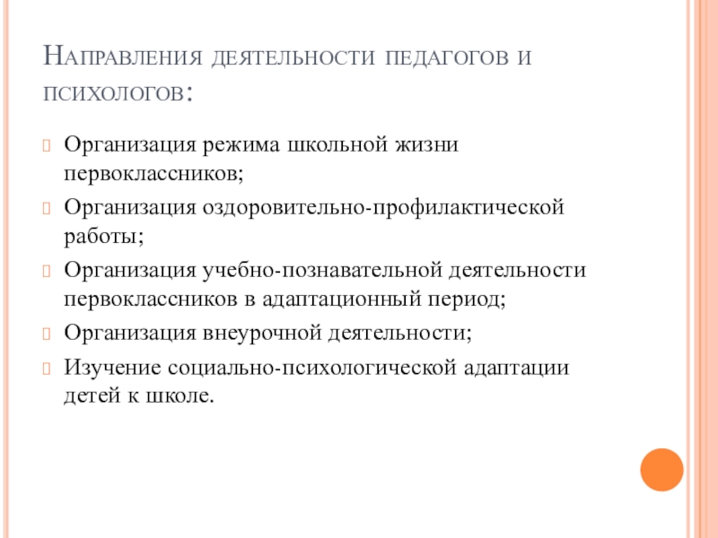 Направления деятельности педагогов и психологов: Организация режима школьной жизни первоклассников;Организация оздоровительно-профилактической работы;Организация учебно-познавательной деятельности первоклассников в адаптационный