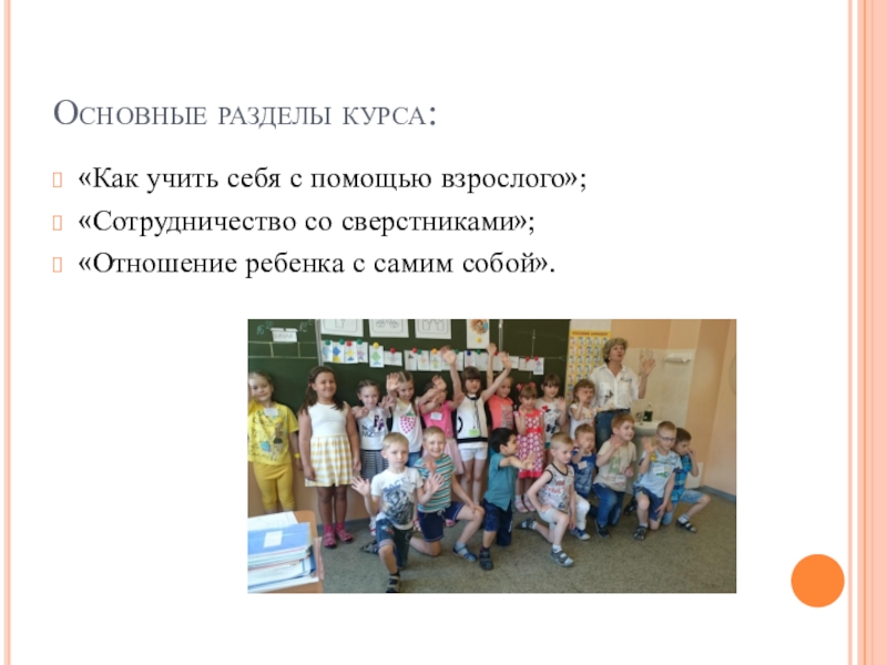 Основные разделы курса:«Как учить себя с помощью взрослого»;«Сотрудничество со сверстниками»;«Отношение ребенка с самим собой».