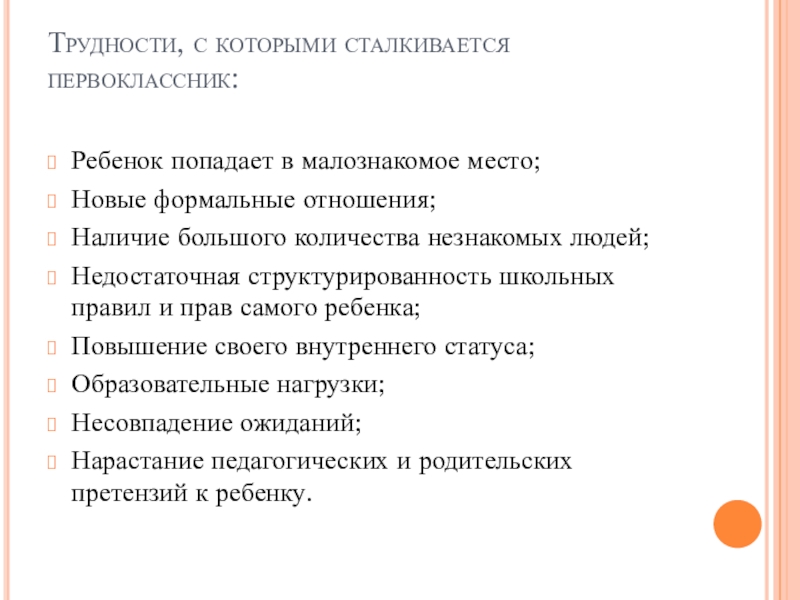 Трудности, с которыми сталкивается первоклассник:Ребенок попадает в малознакомое место;Новые формальные отношения;Наличие большого количества незнакомых людей;Недостаточная структурированность школьных правил и прав самого ребенка;Повышение своего внутреннего статуса;Образовательные нагрузки;Несовпадение ожиданий;Нарастание педагогических и родительских претензий к ребенку.