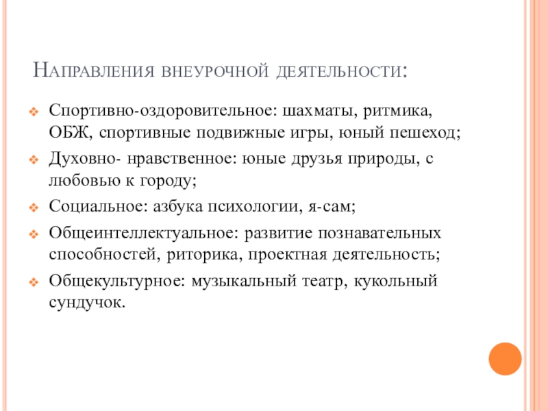 Направления внеурочной деятельности:Спортивно-оздоровительное: шахматы, ритмика, ОБЖ, спортивные подвижные игры, юный пешеход;Духовно- нравственное: юные друзья природы, с любовью