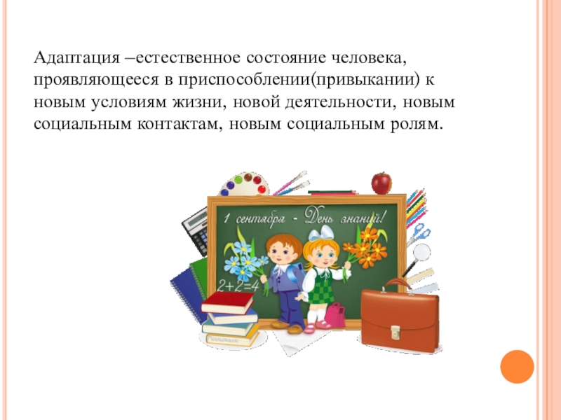 Адаптация –естественное состояние человека, проявляющееся в приспособлении(привыкании) к новым условиям жизни, новой деятельности, новым социальным контактам, новым