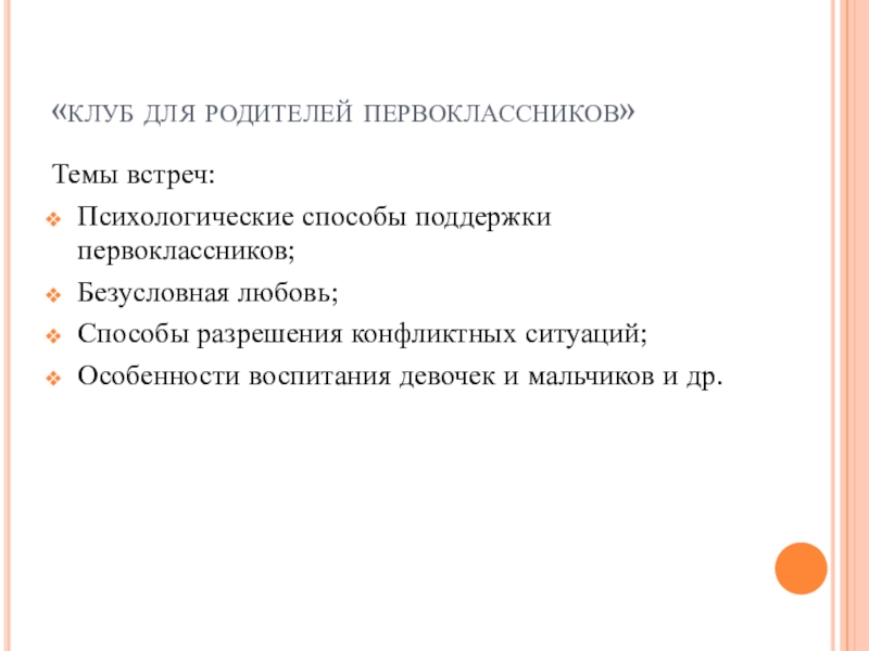 «клуб для родителей первоклассников»Темы встреч:Психологические способы поддержки первоклассников;Безусловная любовь;Способы разрешения конфликтных ситуаций;Особенности воспитания девочек и мальчиков и