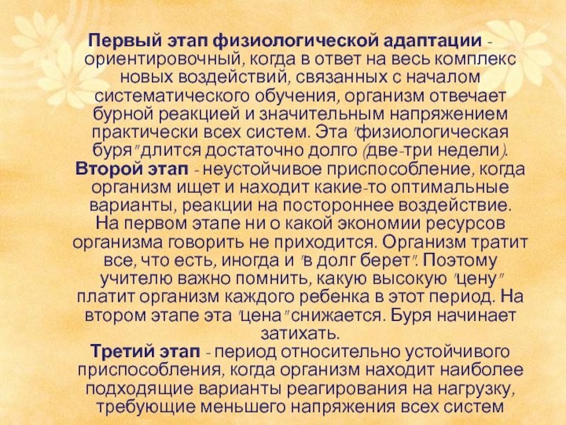 комплекс новых воздействий, связанных с началом систематического обучения, организм отвечает бурной реакцией и значительным напряжением практически всех систем. Эта "физиологическая буря" длится достаточно долго (две-три недели).