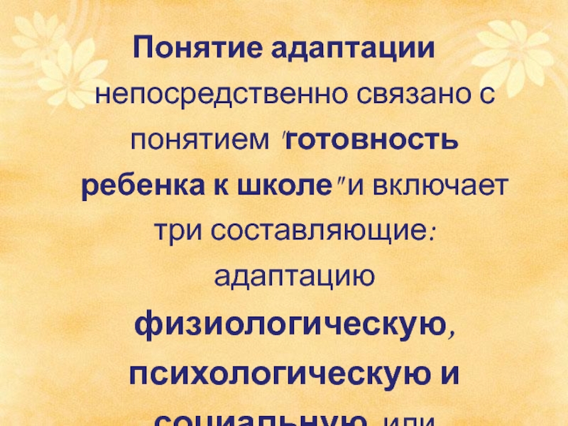 Слайд 5Понятие адаптации непосредственно связано с понятием "готовность ребенка к школе" и