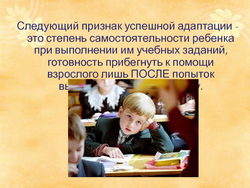 Слайд 13Следующий признак успешной адаптации - это степень самостоятельности ребенка при выполнении