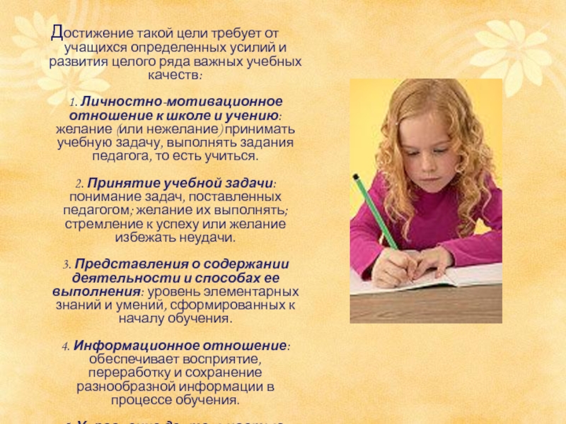 Слайд 16Достижение такой цели требует от учащихся определенных усилий и развития целого