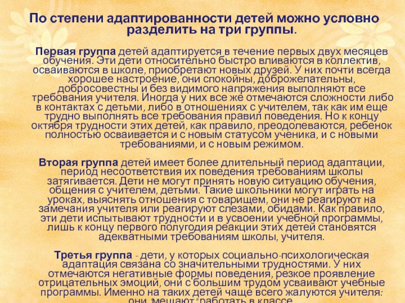 Слайд 6По степени адаптированности детей можно условно разделить на три группы.