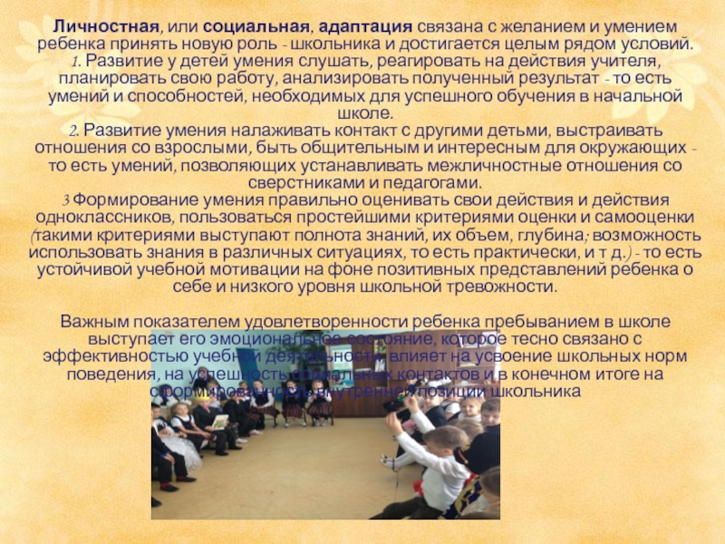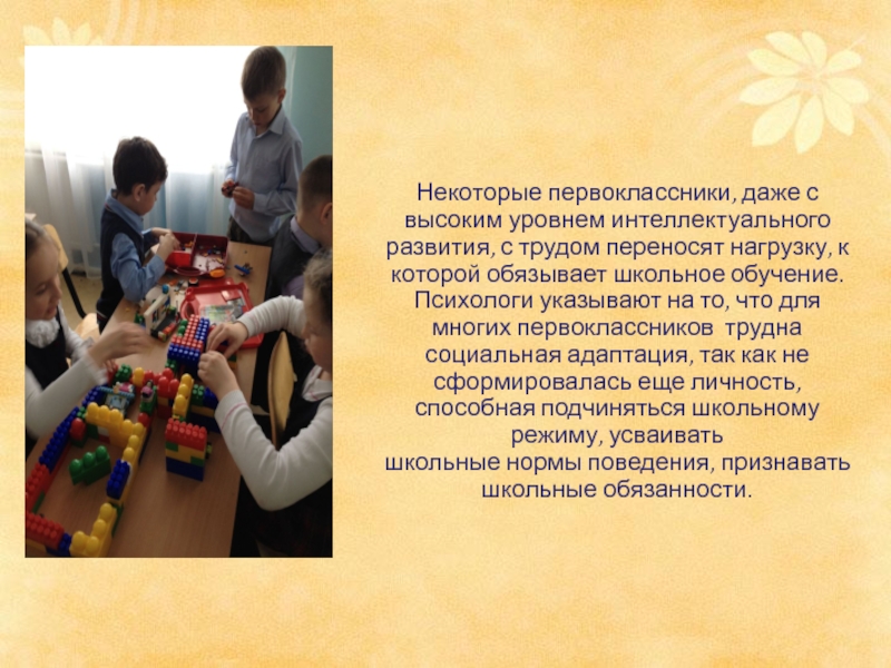 нагрузку, к которой обязывает школьное обучение. Психологи указывают на то, что для многих первоклассников трудна социальная адаптация, так как не сформировалась еще личность, способная подчиняться школьному режиму, усваивать