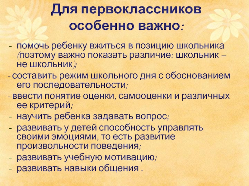 Слайд 10Для первоклассников особенно важно: