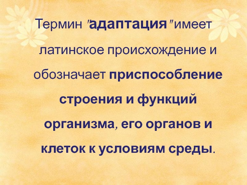 Слайд 3Термин "адаптация" имеет латинское происхождение и обозначает приспособление строения и функций