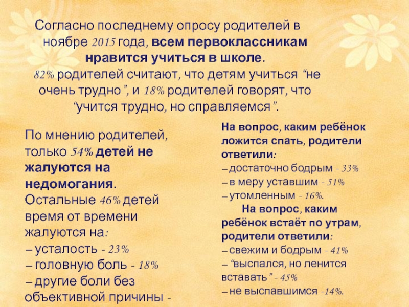 Слайд 23Согласно последнему опросу родителей в ноябре 2015 года, всем первоклассникам нравится