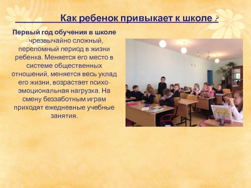 Первый год обучения в школе - чрезвычайно сложный, переломный период в жизни ребенка. Меняется его место в системе общественных отношений, меняется весь уклад его жизни, возрастает психо-эмоциональная нагрузка. На смену беззаботным играм приходят ежедневные учебные занятия.