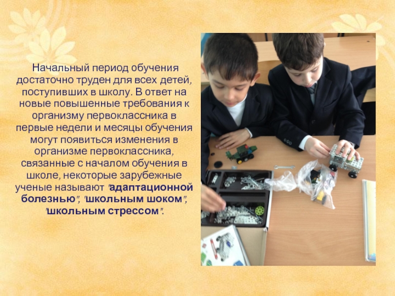 труден для всех детей, поступивших в школу. В ответ на новые повышенные требования к организму первоклассника в первые недели и месяцы обучения могут появиться изменения в организме первоклассника, связанные с началом обучения в школе, некоторые зарубежные ученые называют "адаптационной болезнью", "школьным шоком", "школьным стрессом".