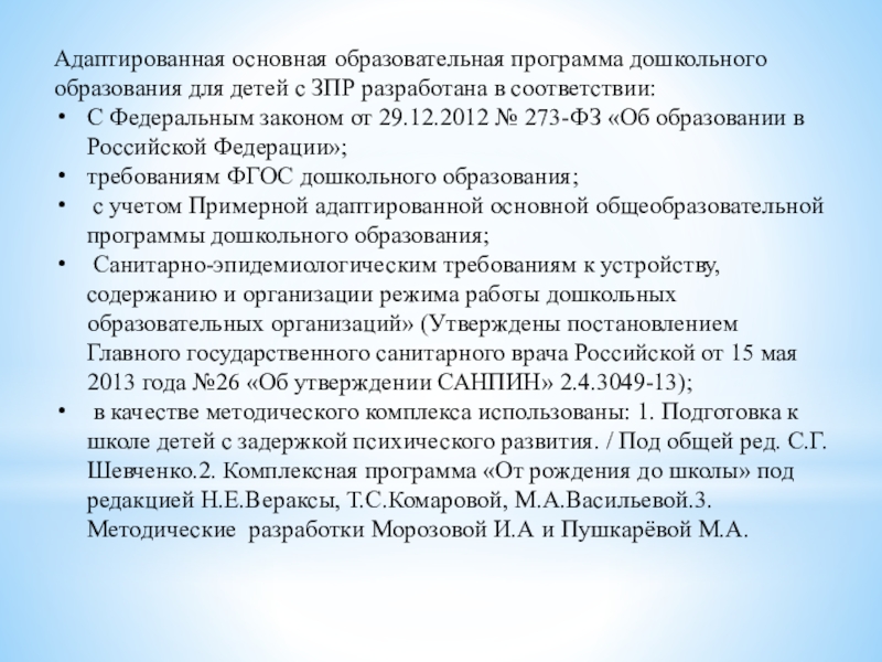 Адаптированная основная образовательная программа дошкольного образования для детей с ЗПР разработана в соответствии: С Федеральным законом от