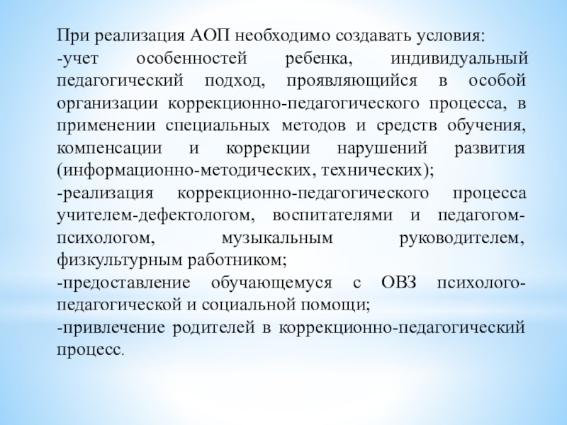 При реализация АОП необходимо создавать условия:-учет особенностей ребенка, индивидуальный педагогический подход, проявляющийся в особой организации коррекционно-педагогического процесса,
