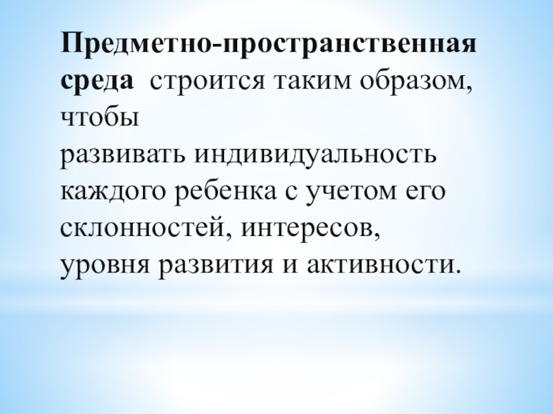 Слайд 7Предметно-пространственная среда  строится таким образом, чтобы развивать индивидуальность каждого ребенка с учетом