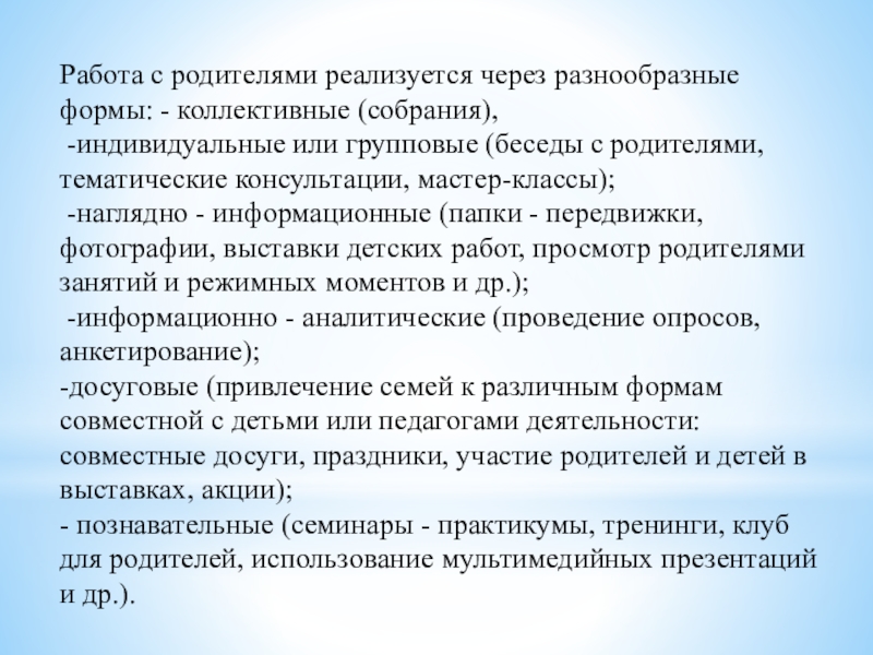 Слайд 8Работа с родителями реализуется через разнообразные формы: - коллективные (собрания),